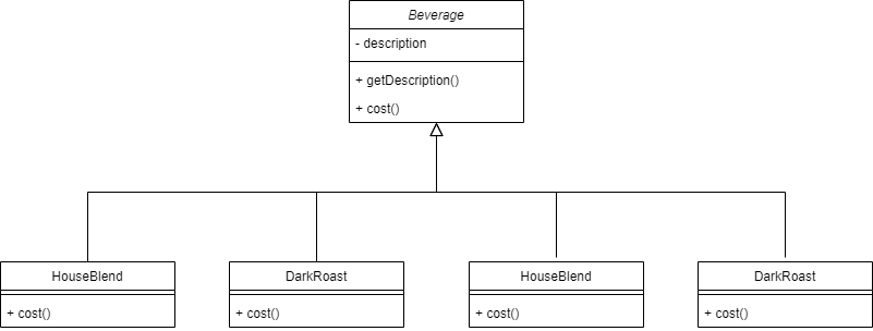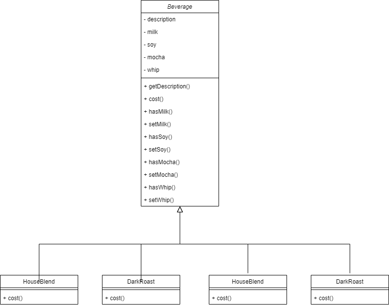 그렇다면 모든 조합을 Beverage를 상속하는 클래스들로 만드는 것이 바람직할까?