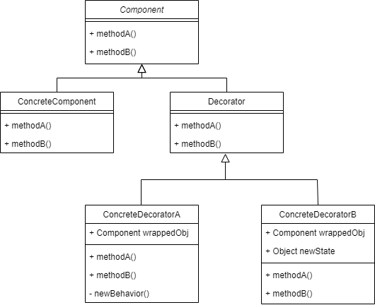 Component는 우리가 사용할 객체의 기본적인 틀이다. 장식할 구체적인 타입(장식대상)은 ConcreteComponent로 되어 있고, 장식 추상 클래스 Decorator에서 자신이 장식할 구성요소와 같은 인터페이스 또는 추상클래스를 구현한다.