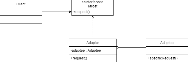 다이어그램에서 클라이언트는 Target 인터페이스만 알고 있는 것을 확인할 수 있다. Adapter는 Adaptee를 멤버로 가지며 Has-a관계를 유지하고 있는 것을 확인할 수 있다.