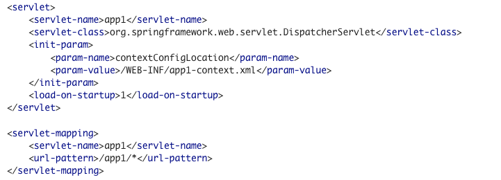 스프링 공식문서에서 가져온 그림인데, <servlet-mapping>이라는 태그 아래에 <url-pattern>에 일치하는 url 요청이 들어오면 app1이라는 서블릿을 호출하겠다는 것이다. 그리고 app1이라는 서블릿은 org.springframework.web.servlet.DispatcherServlet으로 정의가 되어있다는 것이다.